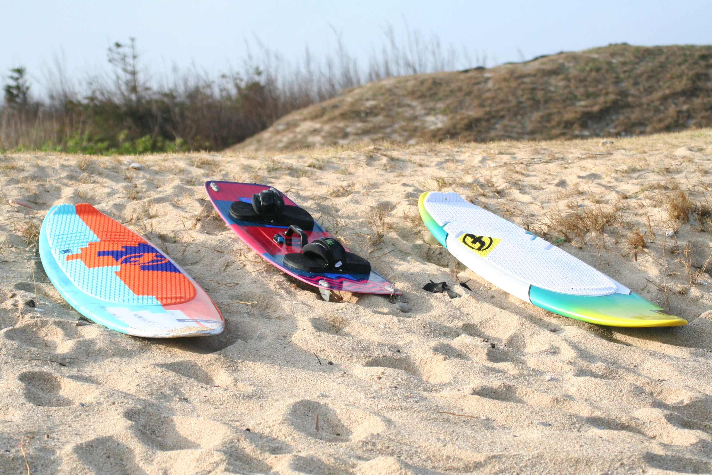 A complete set of kite surfing equipment, including a kite and its control bar, a board (either a twin-tip or a surfboard) and a harness. A wetsuit will be provided if weather is cold in the winter.